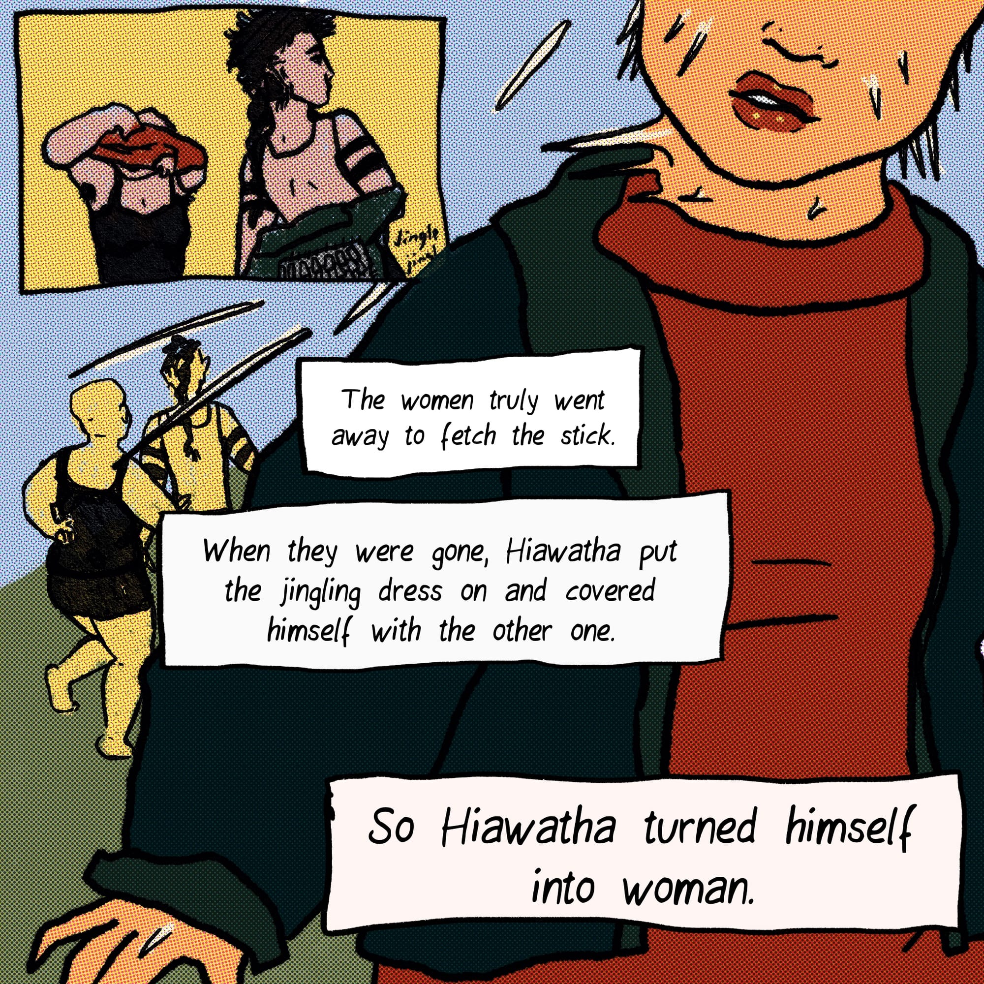 When they were gone, Hiawatha put the jingling dress on and covered himself with the other one.