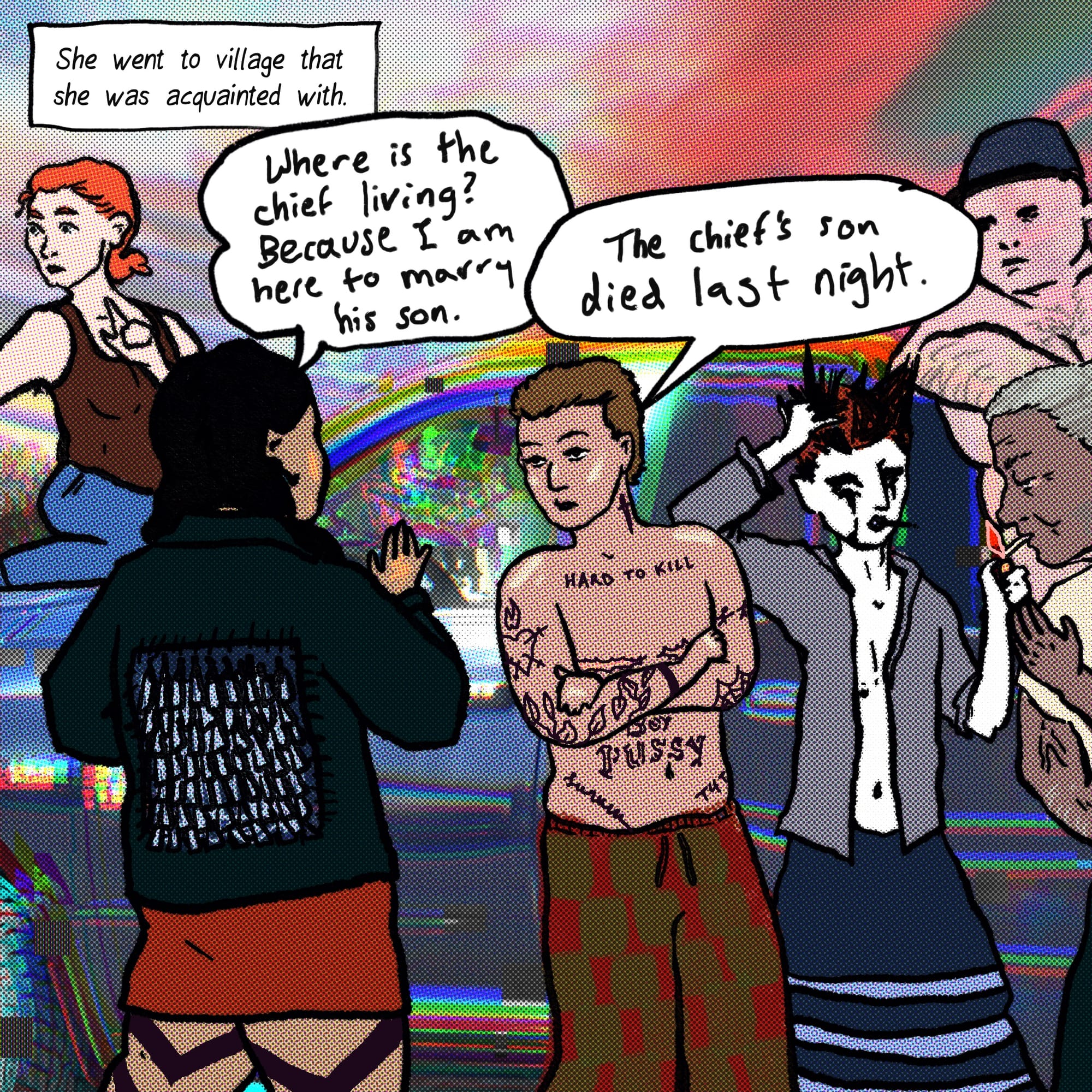 Image Description: The Trickster smirks shyly out of the corner of her eye at the chief's son, a visibly dead man wrapped in a shock blanket and leaned against a chain link fence. He has a cigarette hanging out of his dead lips and his eyes are all bruised. The sky is neon pink and blue.