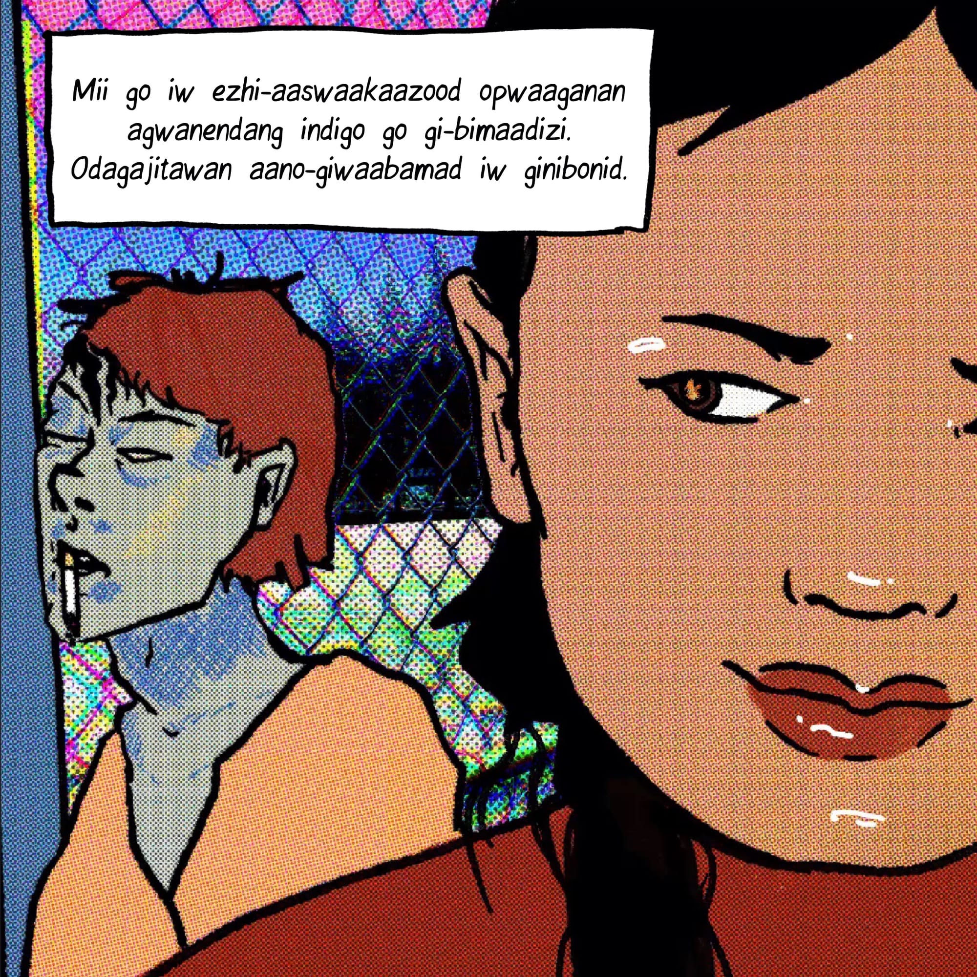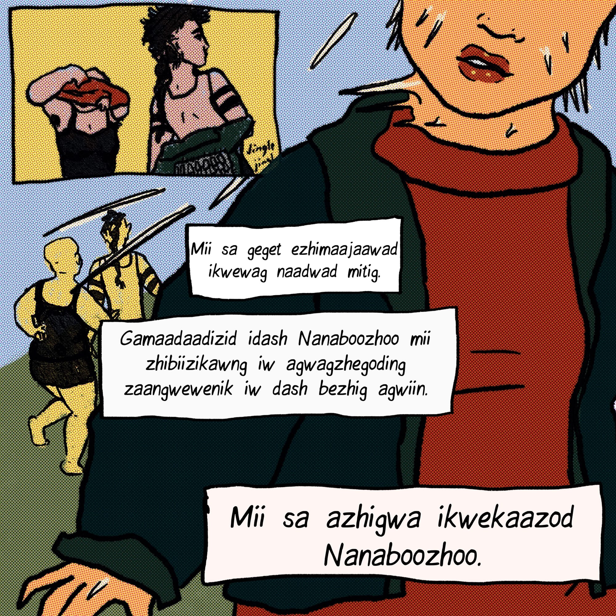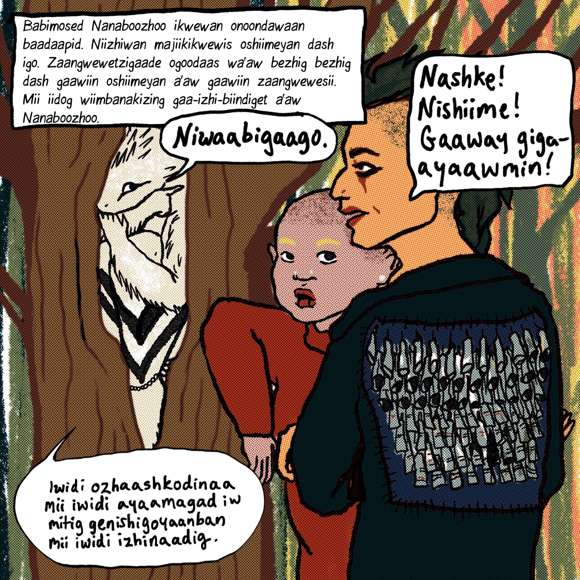 This is a comic by Shaawan Francis Keahna and Waabanokiizhick Mandosking. A transcription of the comic is available below the artwork, and you can read the English-language version of the comic on our website.